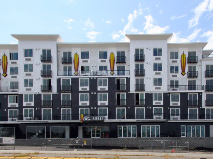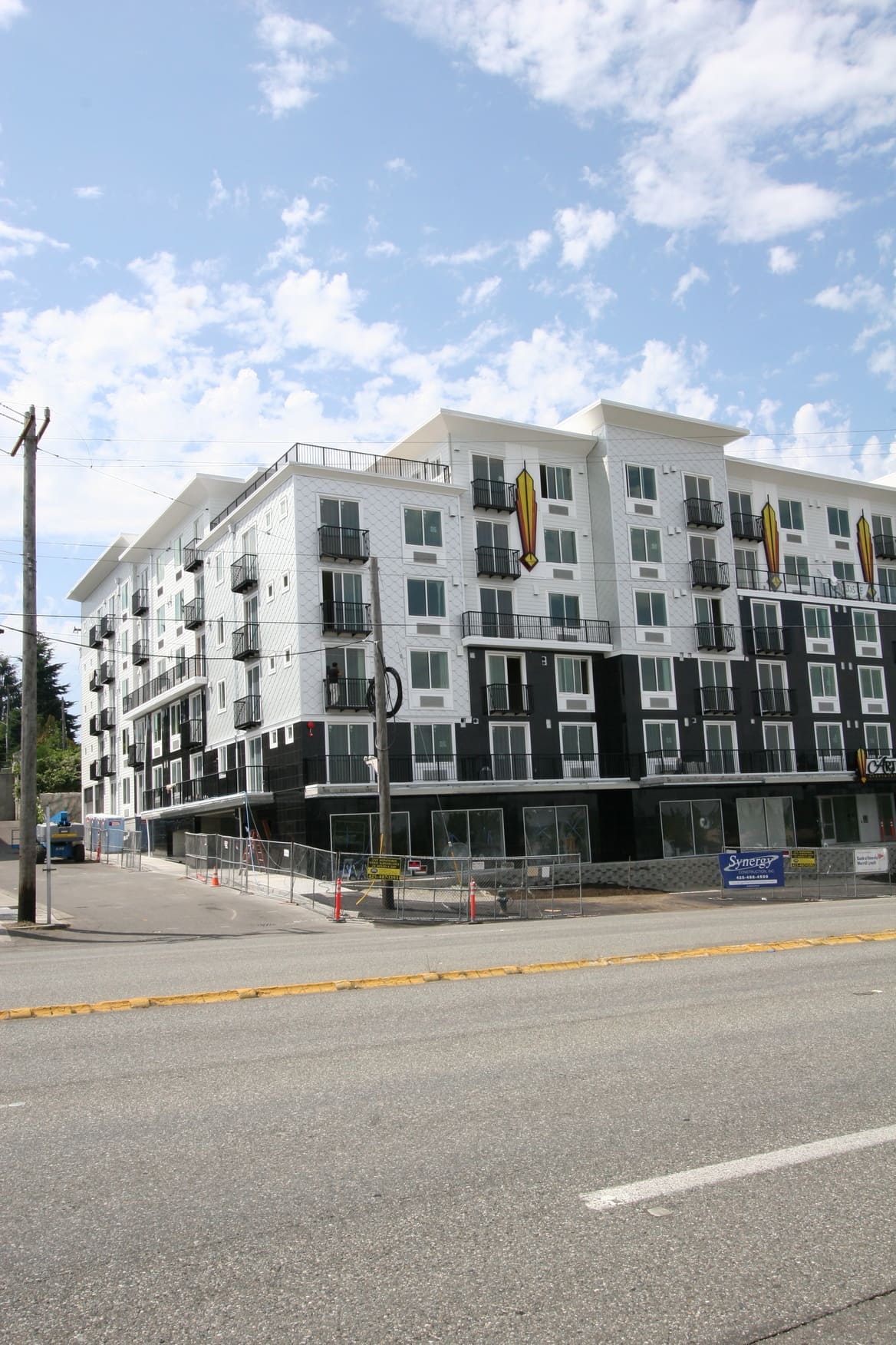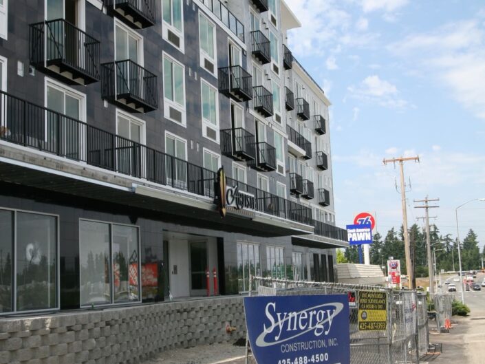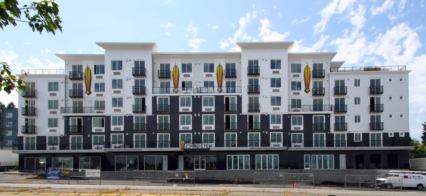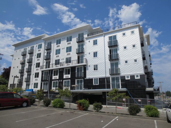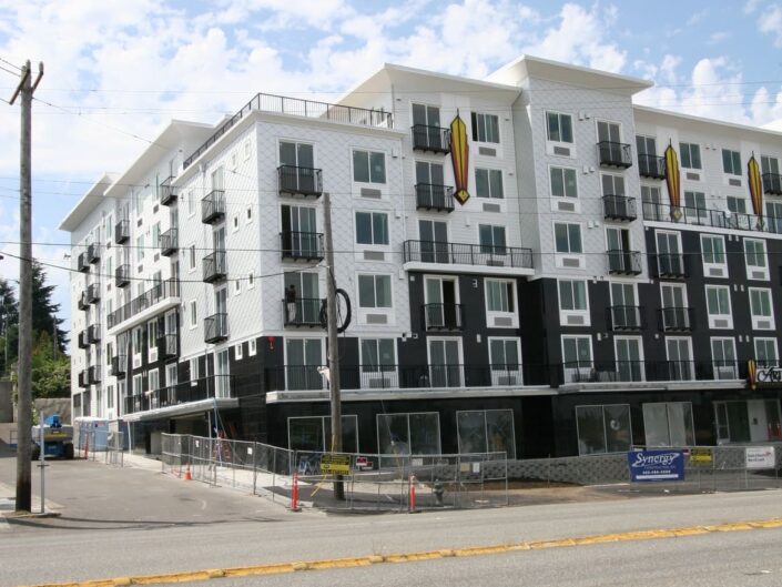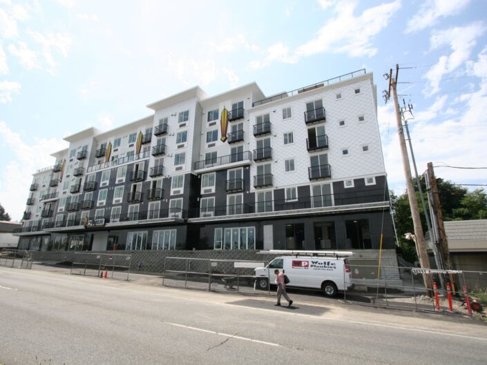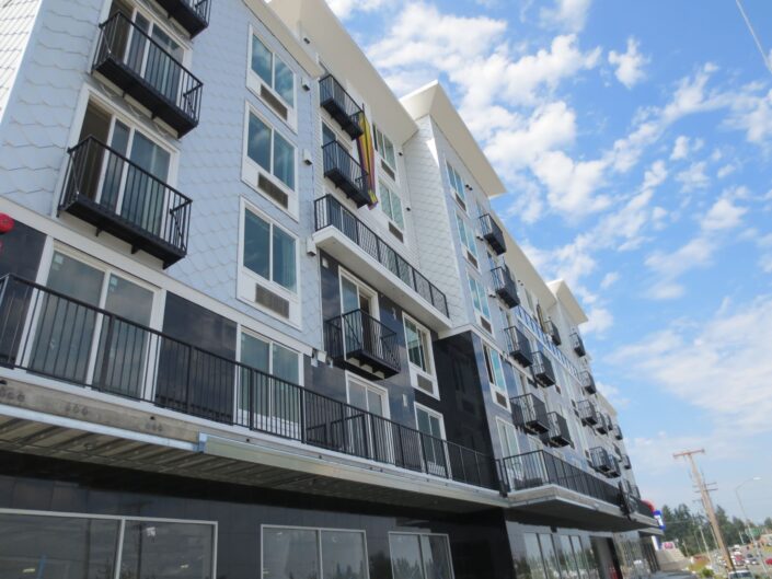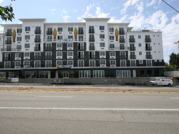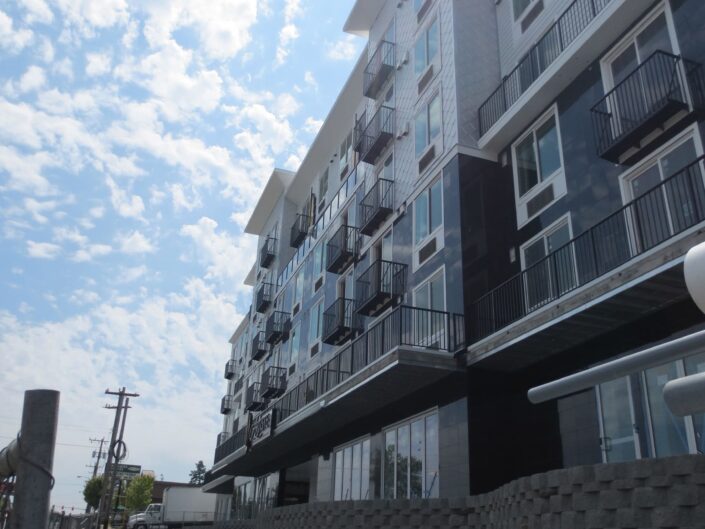 New construction of 148-units of residential over two levels of underground parking and commercial space. The complex is a mix of studio, 1 bedroom and 2 bedroom units, and has two levels of underground parking along with a large area for bicycle parking. The building features a furnished central courtyard with a water feature, a large rooftop green space and pavers, and a luxurious lobby with high-end finishes and an exercise room.