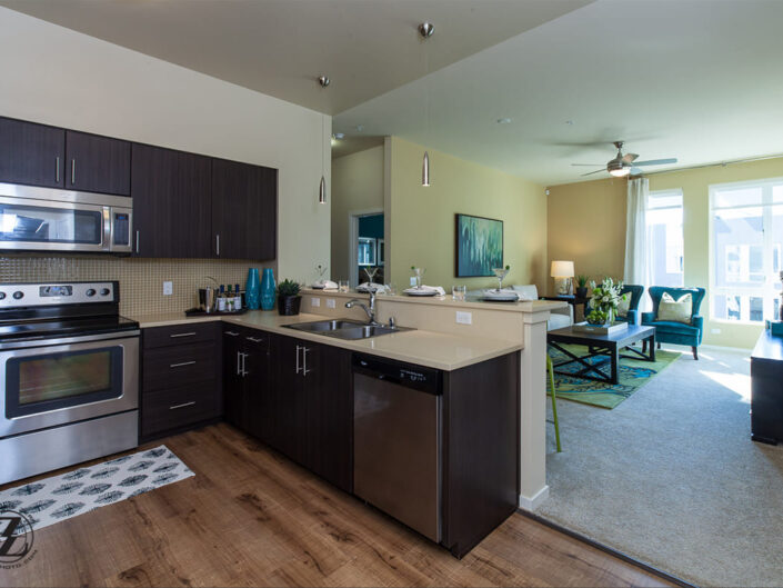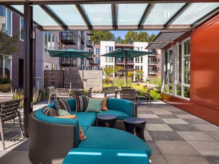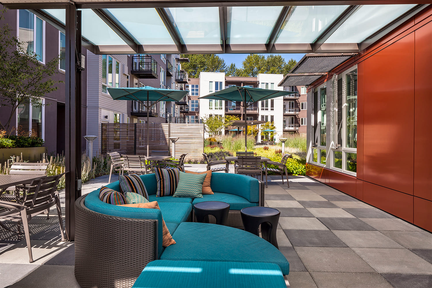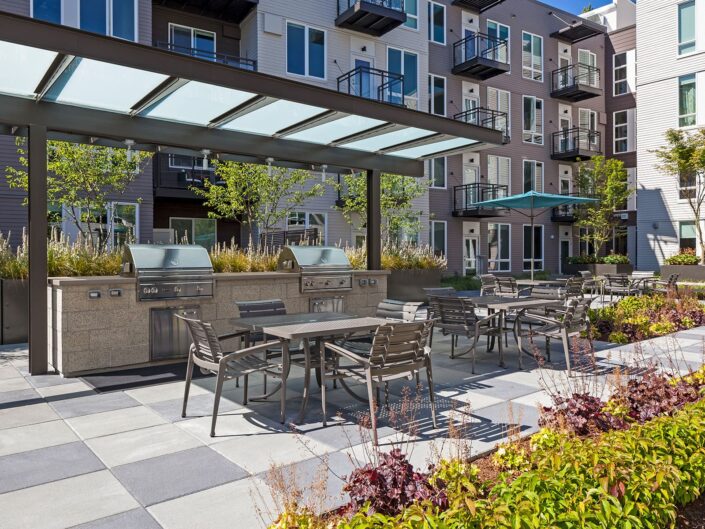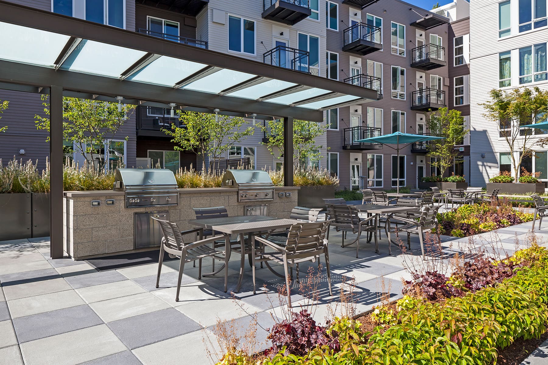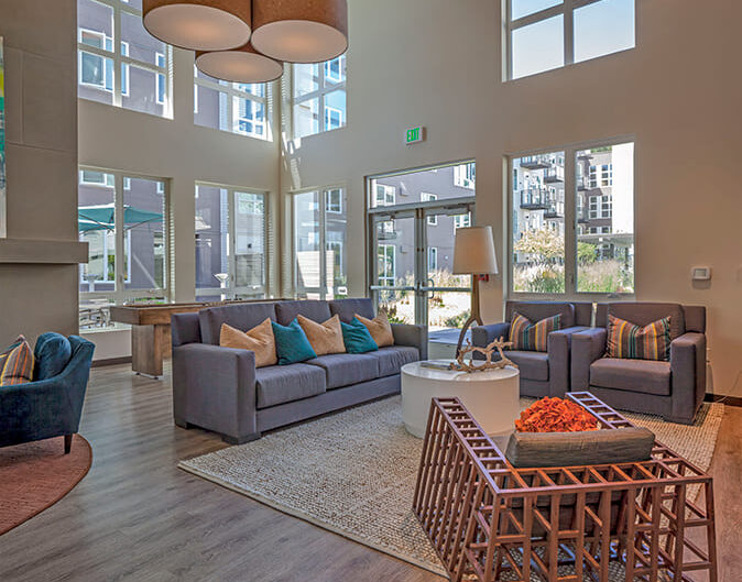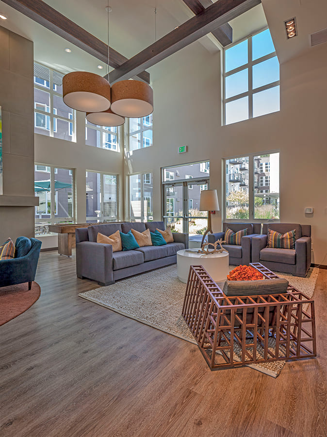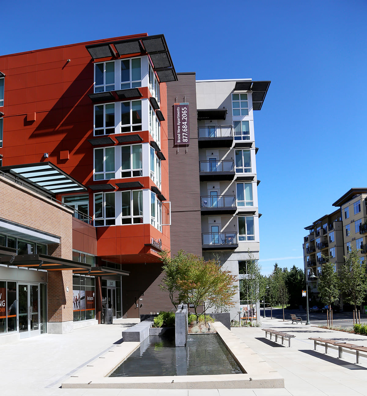 The Aviara Apartments project is a LEED® Silver certified building that is situated at the heart of downtown Mercer Island with stunning floor-to-ceiling views of Lake Washington and the surrounding mountains. Commercial spaces at the Aviara include soaring 23-foot ceiling heights for restaurant or retail uses with glazed covered storefronts spilling out onto an outdoor plaza, decorative water feature, and stepped concrete sitting area. Residential finishes and design features include designer cabinets, quartz countertops, stainless steel appliances, mosaic tile backsplash, hardwood-style floors, walk-in closets, vaulted ceilings, and luxurious soaking tubs.
