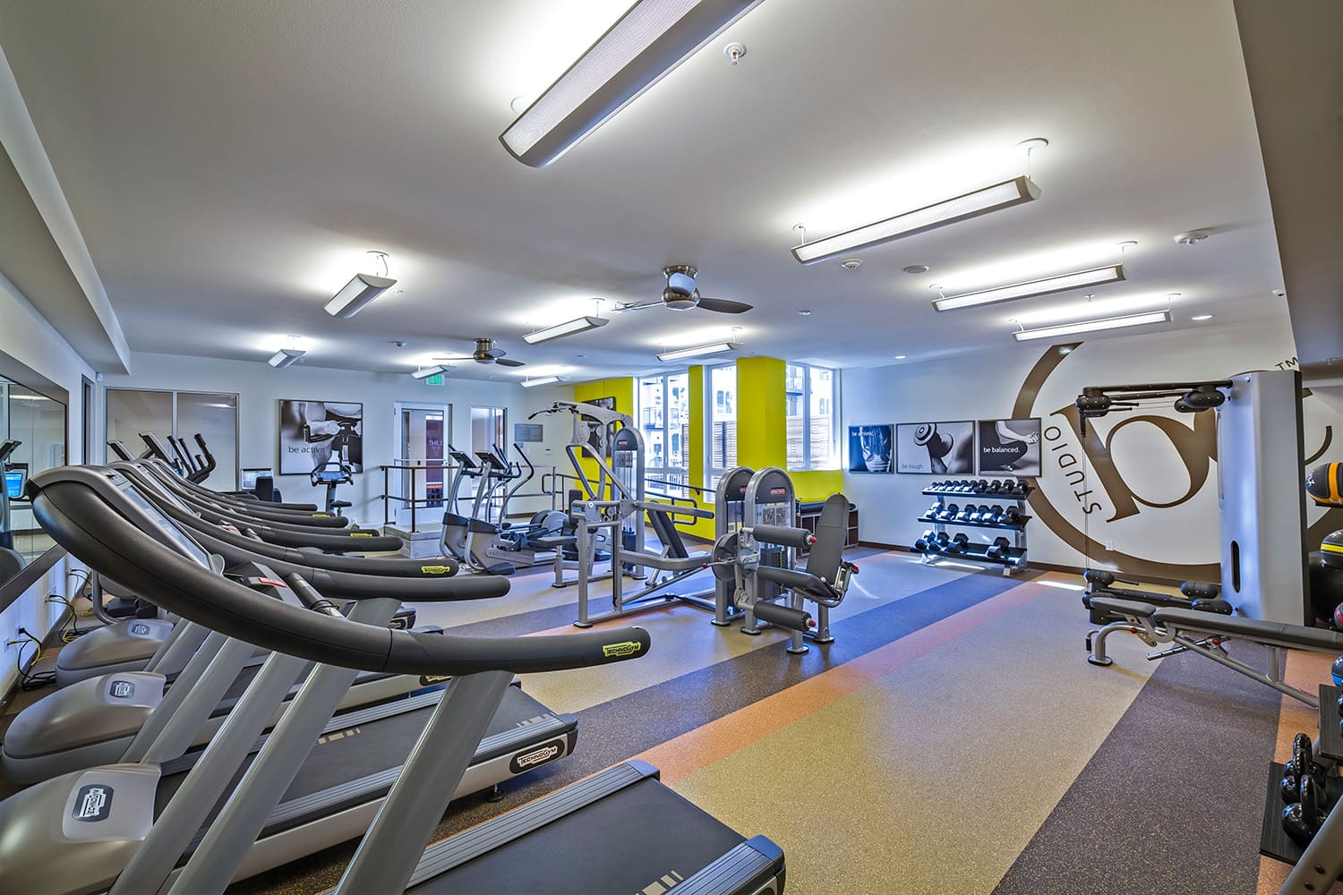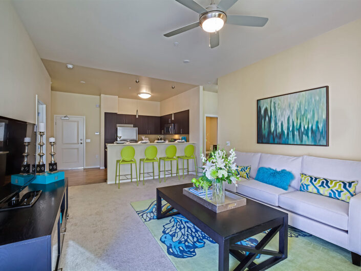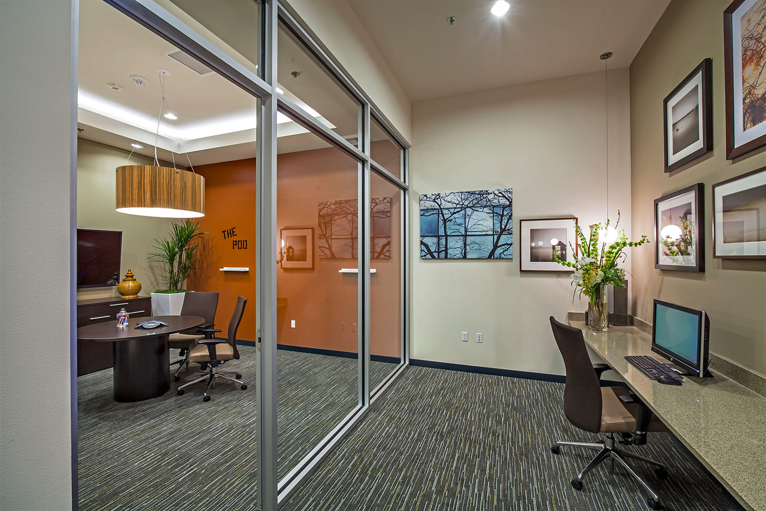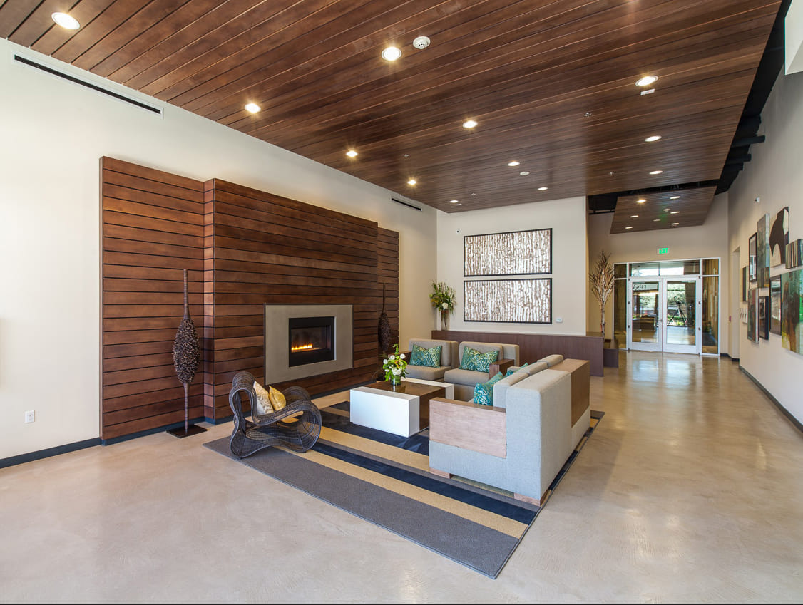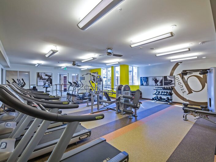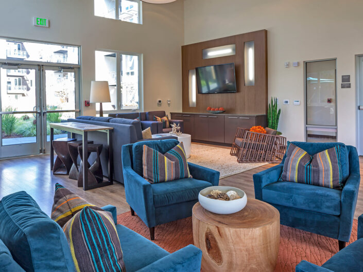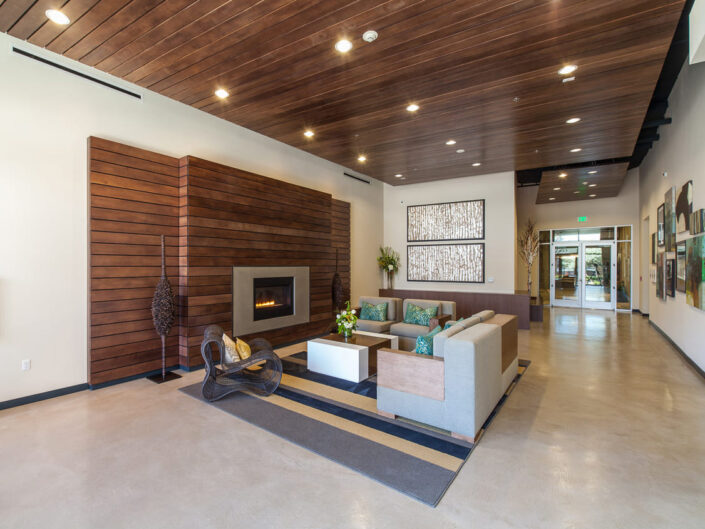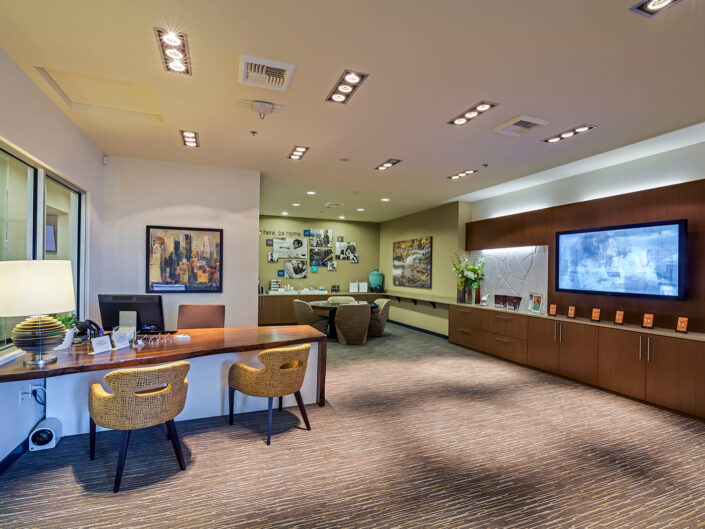 Amenities include a cyber cafe, a Clubroom with decorative concrete wall coverings, culinary kitchen, shuffleboard, and vaulted ceilings in the HDTV lounge. Other amenities include a well-appointed fitness center with interactive cardio equipment and weights, a bicycle repair and storage facility, an outdoor covered view lounge with fireplace, concrete seating areas, pet relief station, and dual covered barbecues.