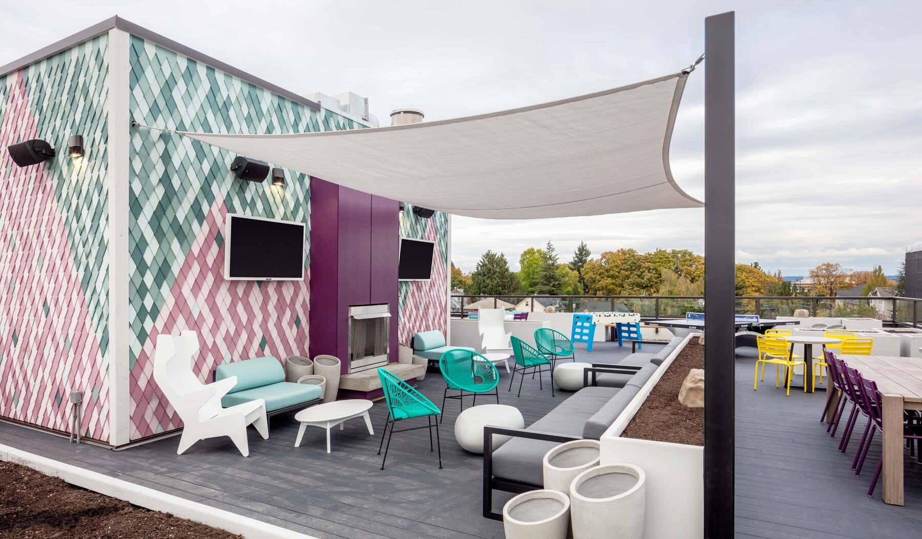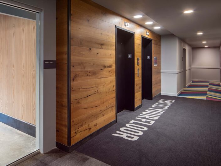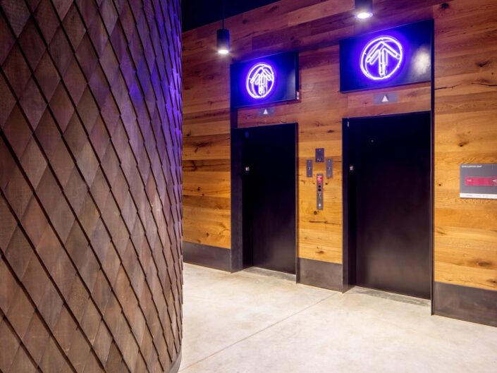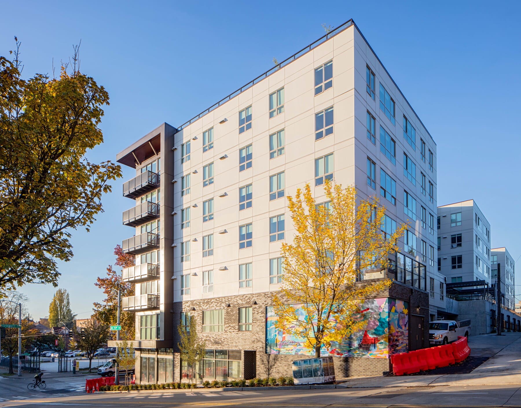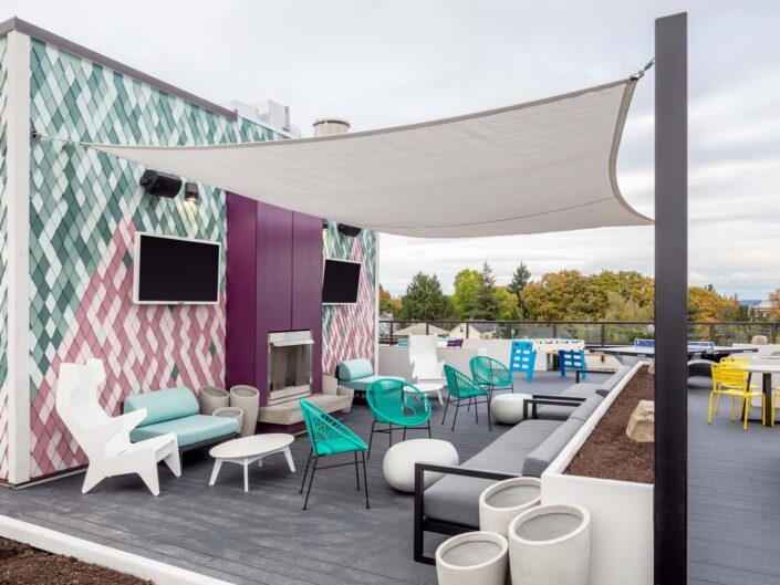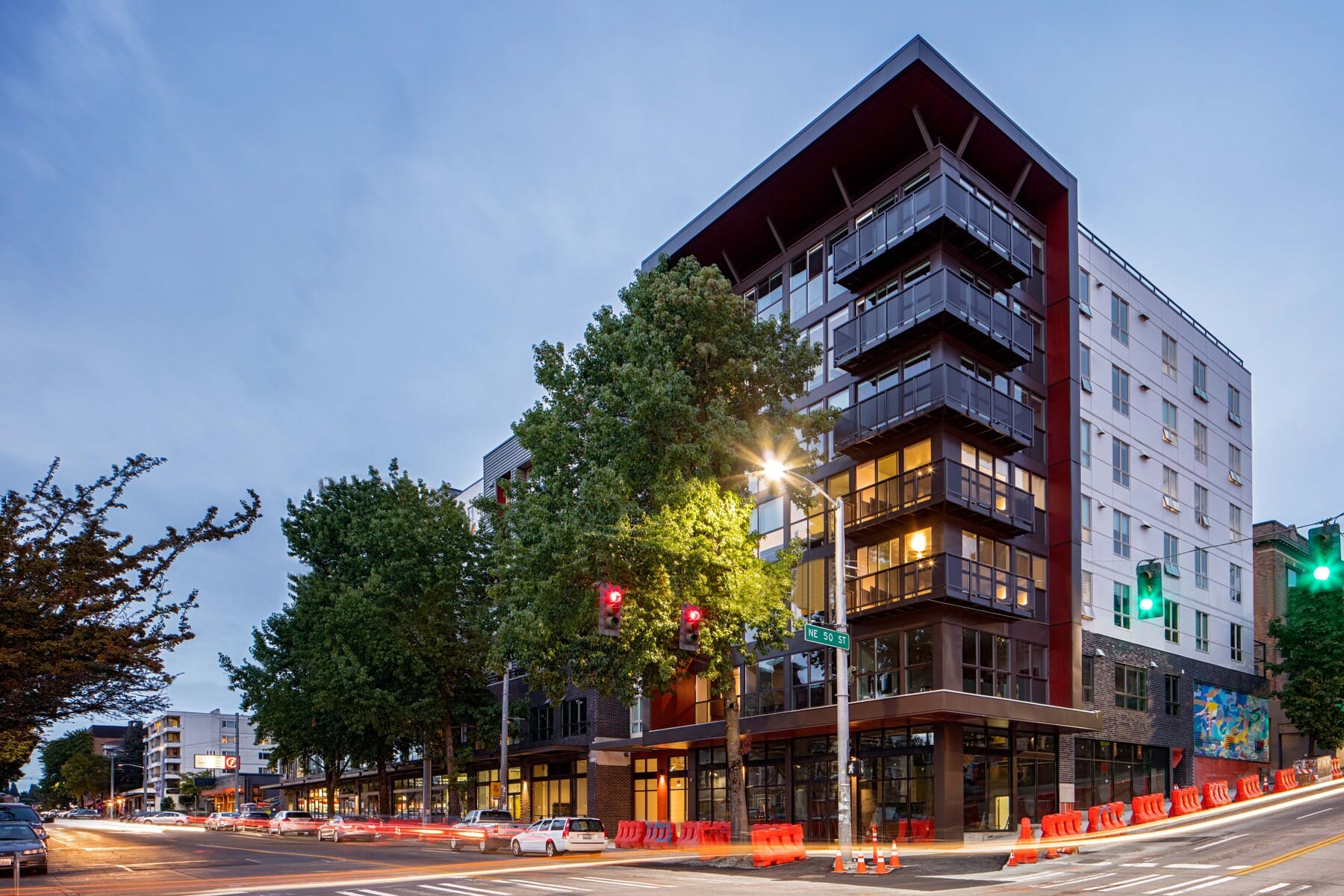 Construction of a 111-unit student housing community with parking and ground-floor retail. The building features three levels of concrete construction with seven levels of wood-frame structure above. The project includes high-end finishes and amenities such as a fitness center, steam room, hot tub, and rooftop lounge.